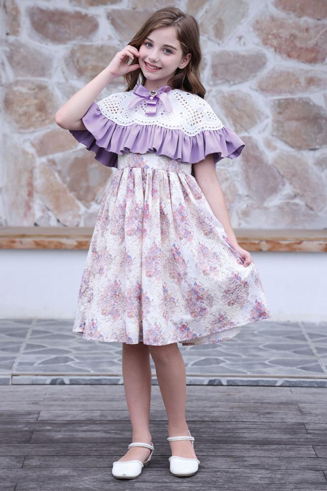 فستان بناتي مشجر يتميز بأبه كبيرة مزينة بفيونكة أعلى الصدر